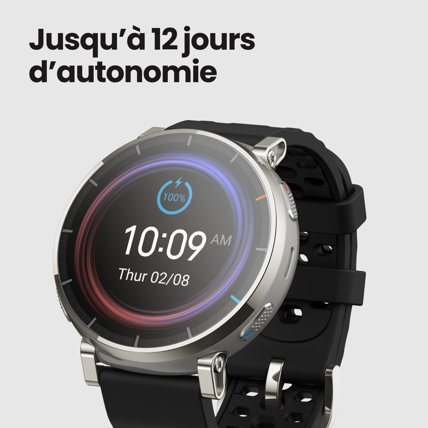 Scénario d'utilisation intensive : luminosité d'écran par défaut, cadran dynamique, assistant vocal activé ; port 24 h/24 et 7 j/7/fréquence cardiaque toujours activée (toutes les minutes)/surveillance du sommeil assistée/surveillance de la qualité de la respiration pendant le sommeil (8 h /jour)/surveillance du stress ; Hebdomadaire : 30 minutes d'appels Bluetooth, 60 minutes de lecture de musique, 210 minutes d'activité GPS ; Quotidien : 100 activations par lever le poignet, 150 notifications de messages (écran allumé), 3 appels entrants, 4 paiements NFC, 15 minutes d'interaction avec l'écran allumé.