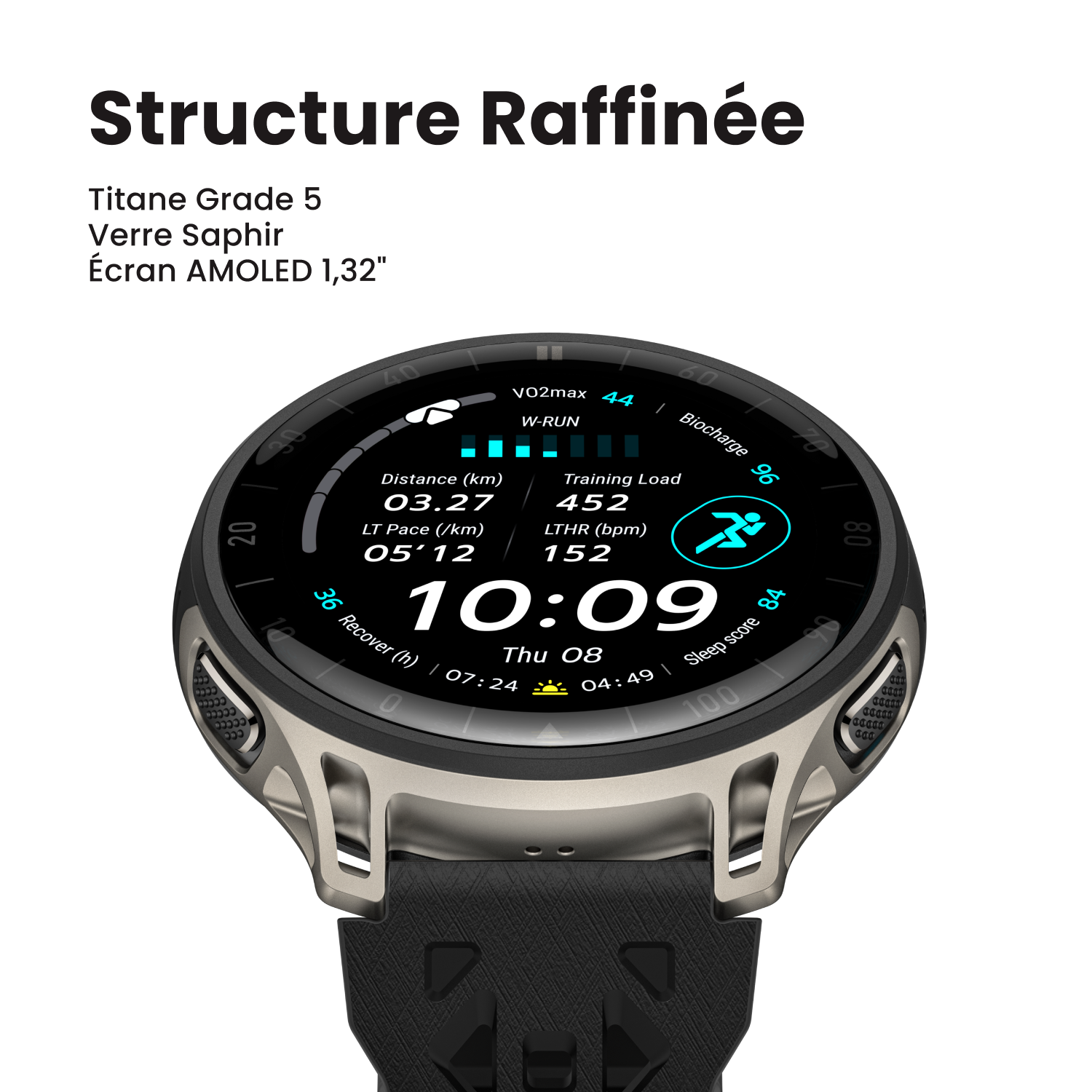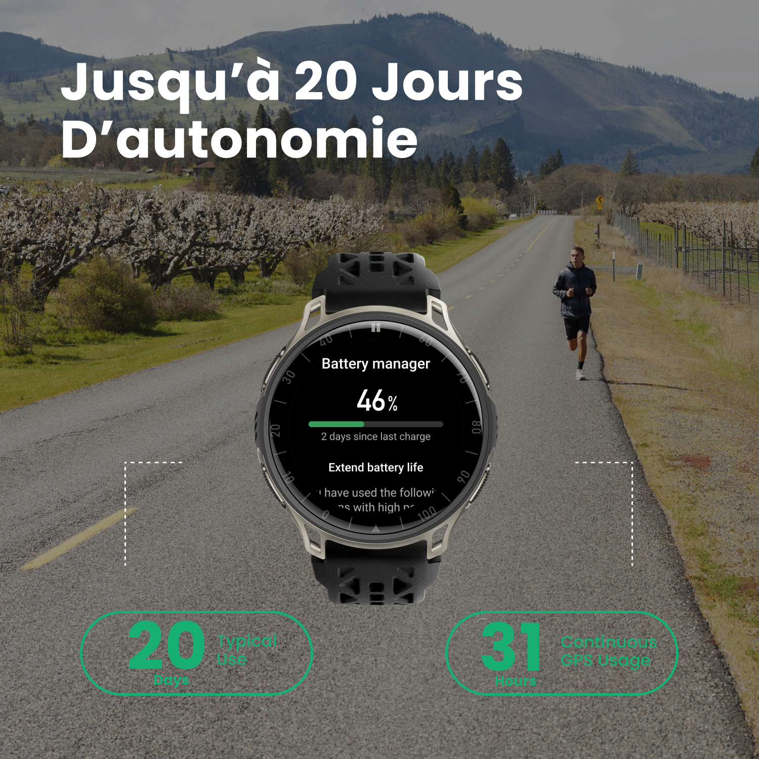 Durée d'utilisation continue du GPS (mode de précision ; double bande, tous systèmes satellitaires) : activité GPS continue, fréquence cardiaque toujours activée, y compris l'enregistrement de la trajectoire de la montre.
