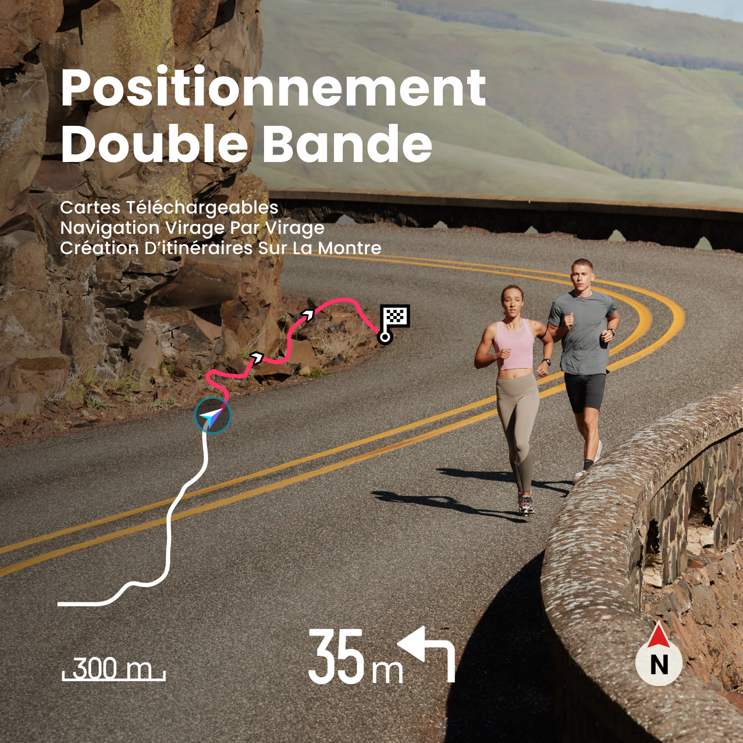 Utilisation continue du GPS avec lecture de musique (double bande, tous systèmes satellitaires) : active le mouvement GPS continu, maintient le moniteur de fréquence cardiaque toujours actif, y compris le suivi de la trajectoire par la montre, la lecture de musique par la montre, avec sortie audio via des écouteurs Bluetooth.