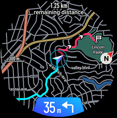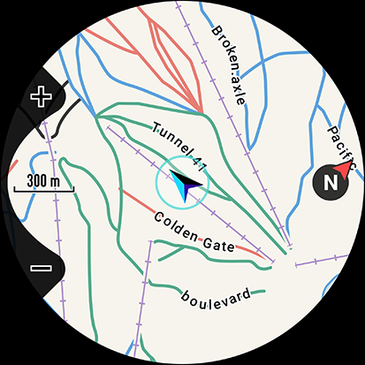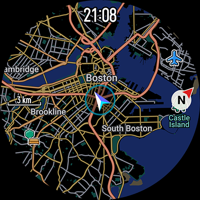 - La carte située sur le côté de la montre vous permet d'afficher des informations sur les points d'intérêt, tels que les magasins, les hôpitaux, les salles de bains, les stades et d'autres identifiants géographiques.