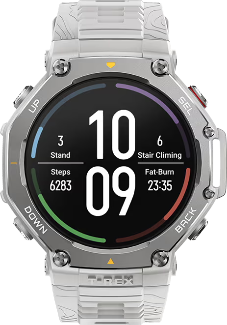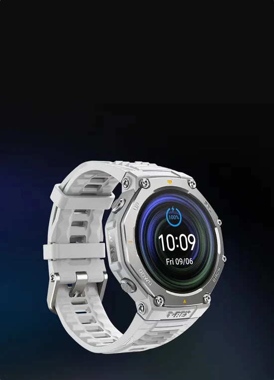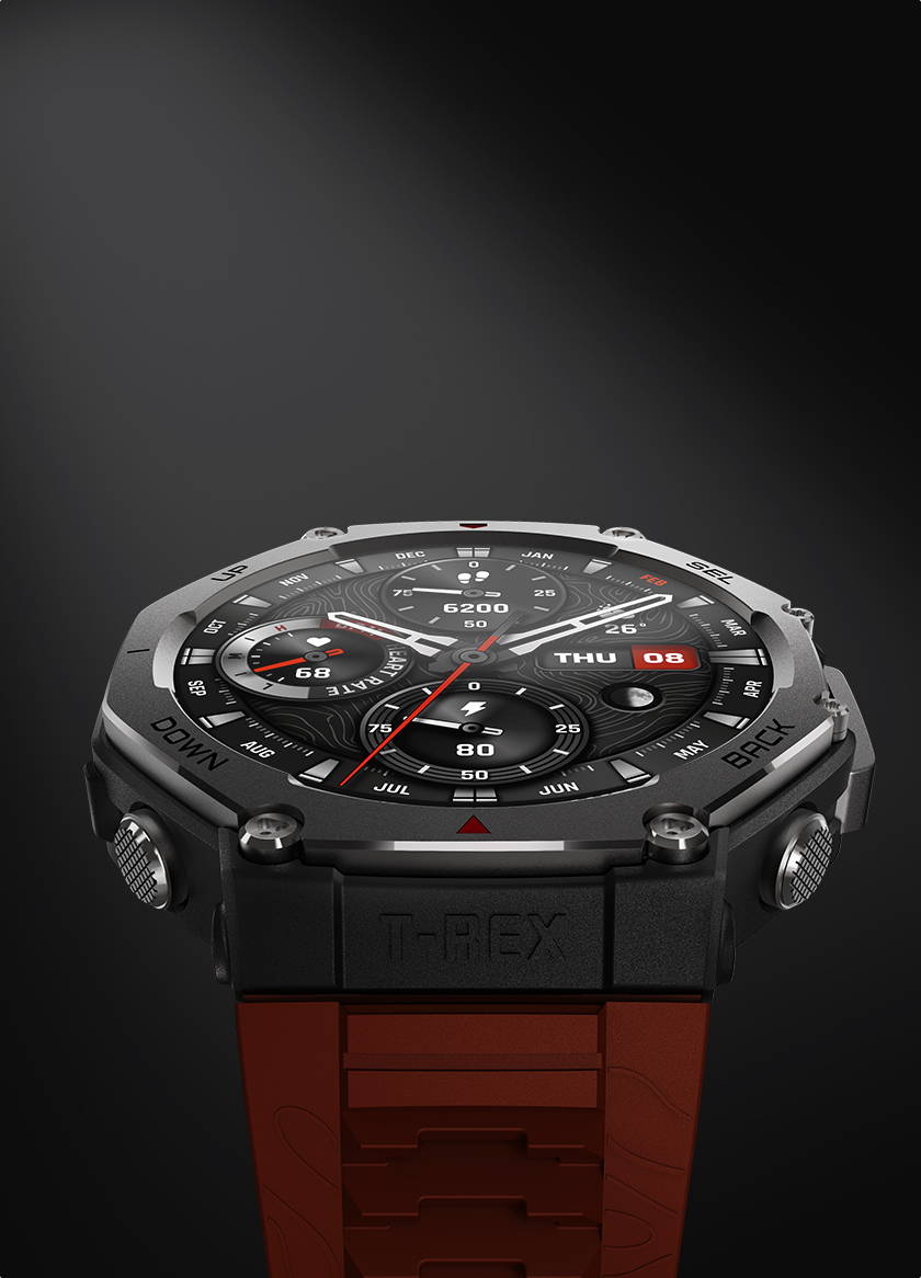 Avec son très grand écran lumineux et son boîtier de qualité militaire¹ , l'Amazfit T-Rex 3 est prêt à relever tous les défis que vous envisagez.