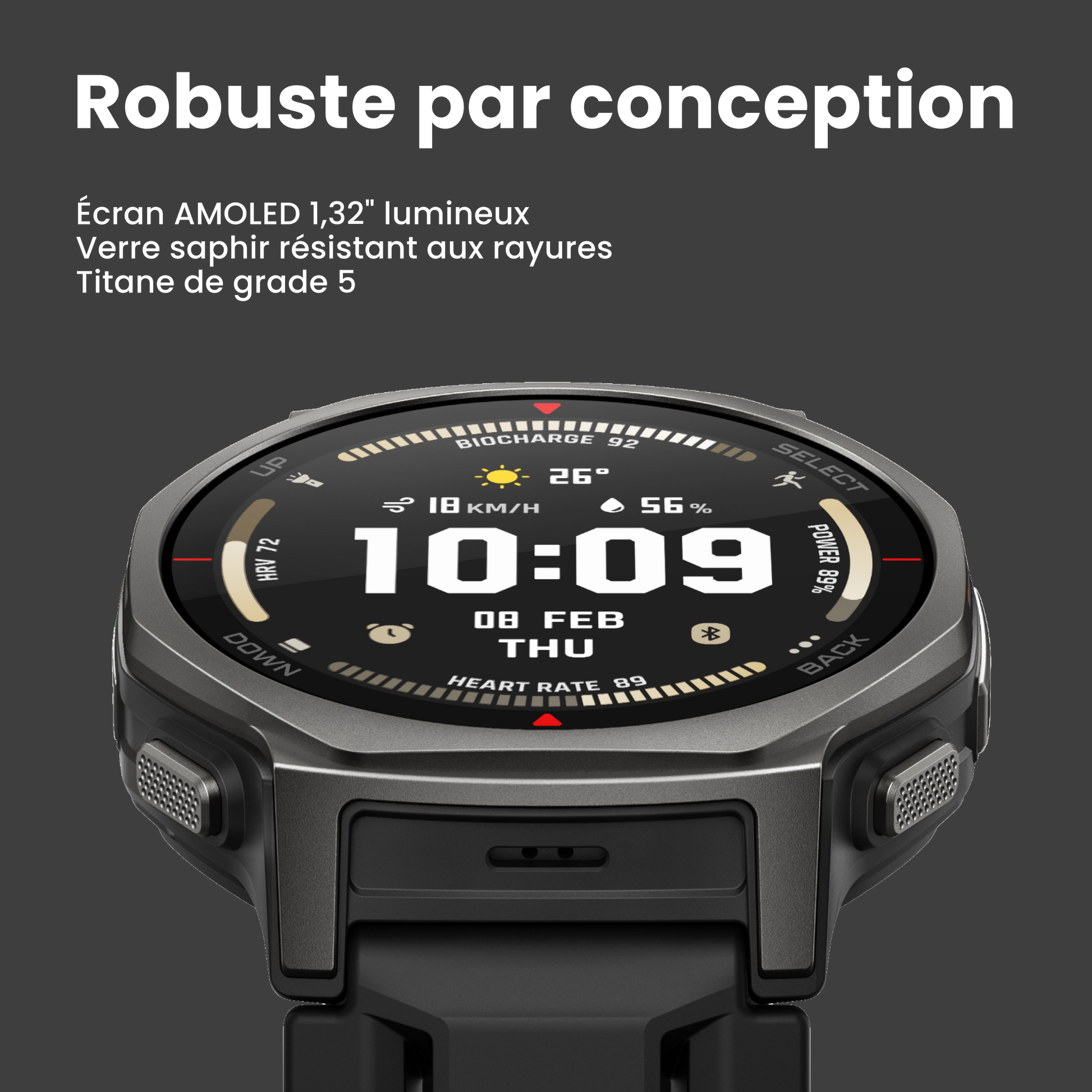• Verre saphir résistant aux rayures avec un écran AMOLED vibrant de 1,32" (44 mm)